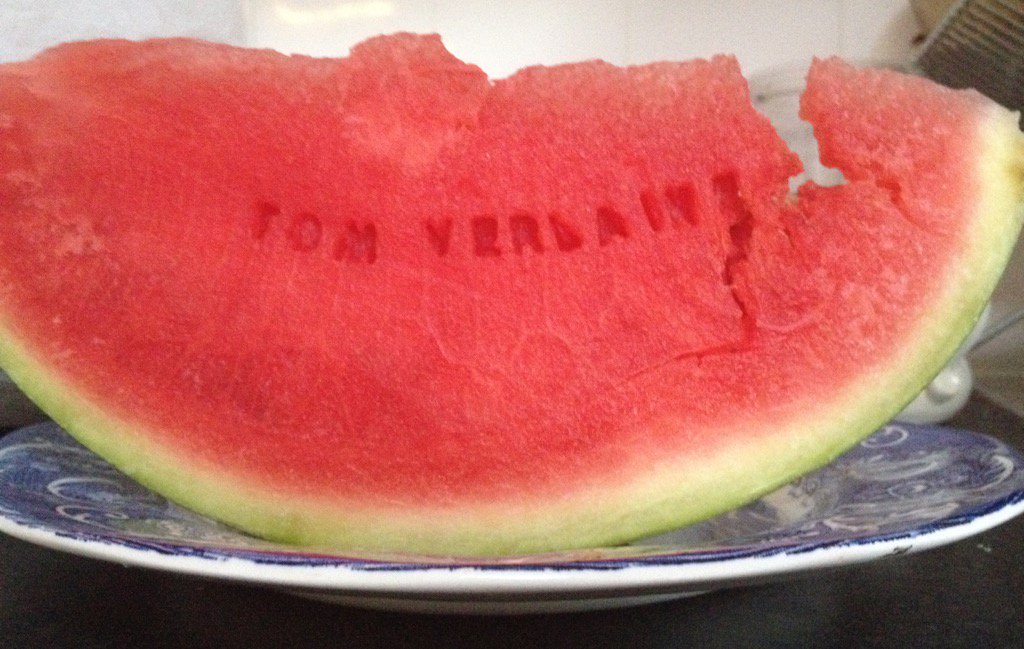 Two members of Television, each stamped onto a slice of watermelon. mixed media
